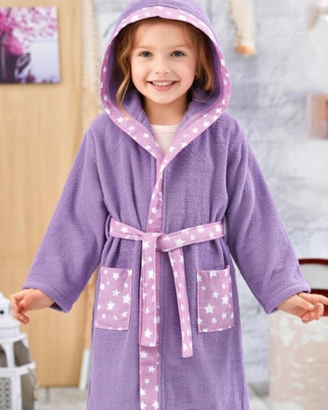 Çocuk Bornozu Kız Erkek Kapşonlu Bornoz %100 Pamuklu LİLA