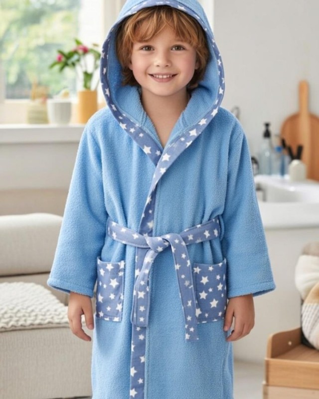 Çocuk Bornozu Kız Erkek Kapşonlu Bornoz %100 Pamuklu MAVİ