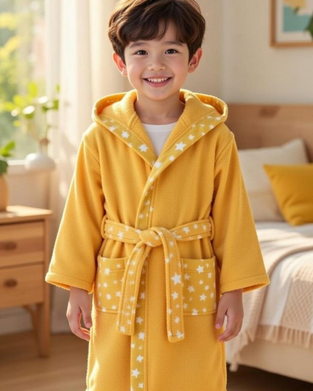 Çocuk Bornozu Kız Erkek Kapşonlu Bornoz Pamuklu SARI