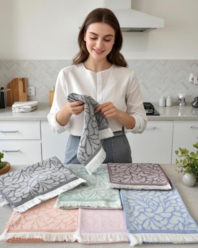 - Yaprak desenleriyle süslenmiş, mutfaklarınıza doğal bir güzellik katan 6'lı yaprak desen el ve mutfak havlusu seti.